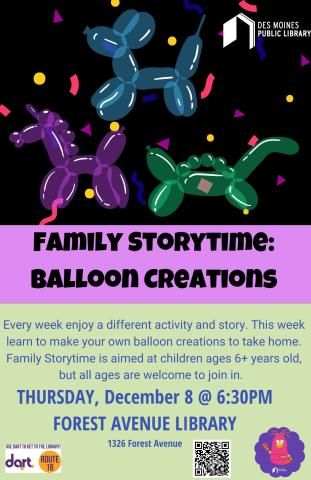 Every week enjoy a different activity and story. This week learn to make your own balloon creations to take home. Family Storytime is aimed at children ages 6+, but all ages are welcome to join in.