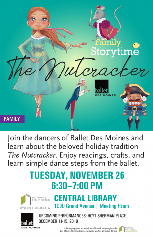 Join the dancers of Ballet Des Moines and learn about the beloved holiday tradition The Nutcracker. Enjoy readings, crafts, and learn simple dance steps from the ballet.