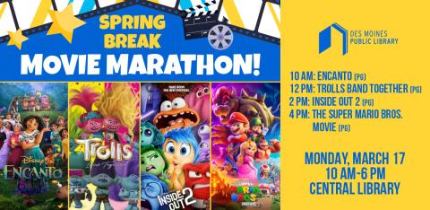 Kick off your spring break at the Central Library with a movie and craft marathon! Each movie will have an accompanying themed craft to work on as you watch the film.