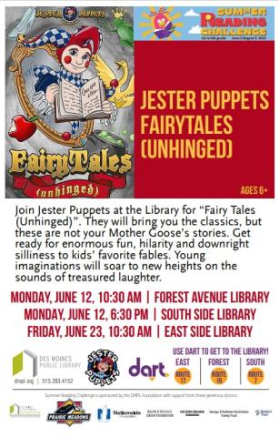 Join Jester Puppets at the Library for “Fairy Tales (Unhinged)”. They will brings you the classics, but these are not your Mother Goose’s stories. Get ready for enormous fun, hilarity and downright silliness to kids’ favorite fables. Young imaginations will soar to new heights on the sounds of treasured laughter. Best for ages 6+