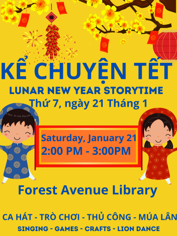 Xin mời các quý vị cùng tham gia một chương trình đặt biệt – Kể Chuyện Song Ngữ Tết – tại thư viện Forest Avenue vào thứ 7, ngày 21 tháng 1. Các em sẽ nghe những câu chuyện về tết, ca hát, chơi trò chơi, làm thủ công và coi múa lân.