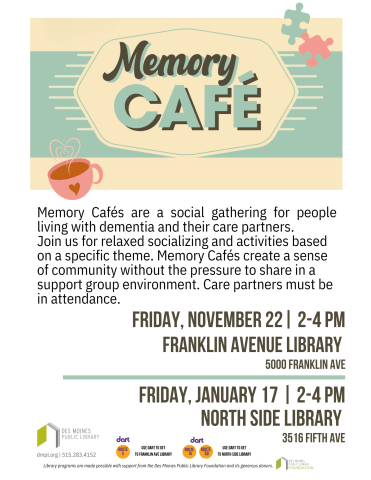 Memory Cafés provide a welcoming social gathering for people living with dementia and their care partners, focusing on person-centered care for those living with dementia. We'll begin with relaxed socializing, move on to a planned activity revolving around a specific theme, and end with more social time. Memory Cafés create a sense of community without the pressure to share in a support group environment.