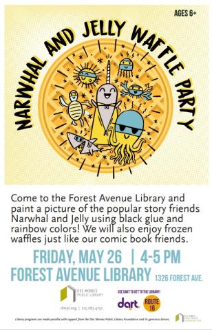 Come to the Forest Avenue Library and paint a picture of the popular story friends Narwhal and Jellyfish using black glue and rainbow colors!  We will enjoy frozen waffles just like our comic book friends. Best for ages 6+, as supplies last!