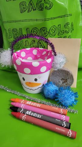 Sé creativo y construye un muñeco de nieve usando una minimaceta. Se proporcionará pegamento caliente para aquellos que elijan hacer la manualidad en la biblioteca. Esta manualidad está designada para mayores de 5 años y es por orden de llegada; hasta agotar existencias.