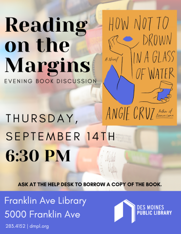 Our September selection is How Not to Drown in a Glass of Water by Angie Cruz. Copies will be available for pick-up at the Franklin Ave Library Help Desk starting August 11th.