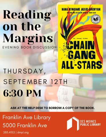 Our September selection is Chain Gang All-Stars by Nana Kwame Adjei-Brenyah. Copies will be available for pick-up at the Franklin Ave Library Help Desk starting August 9th.
