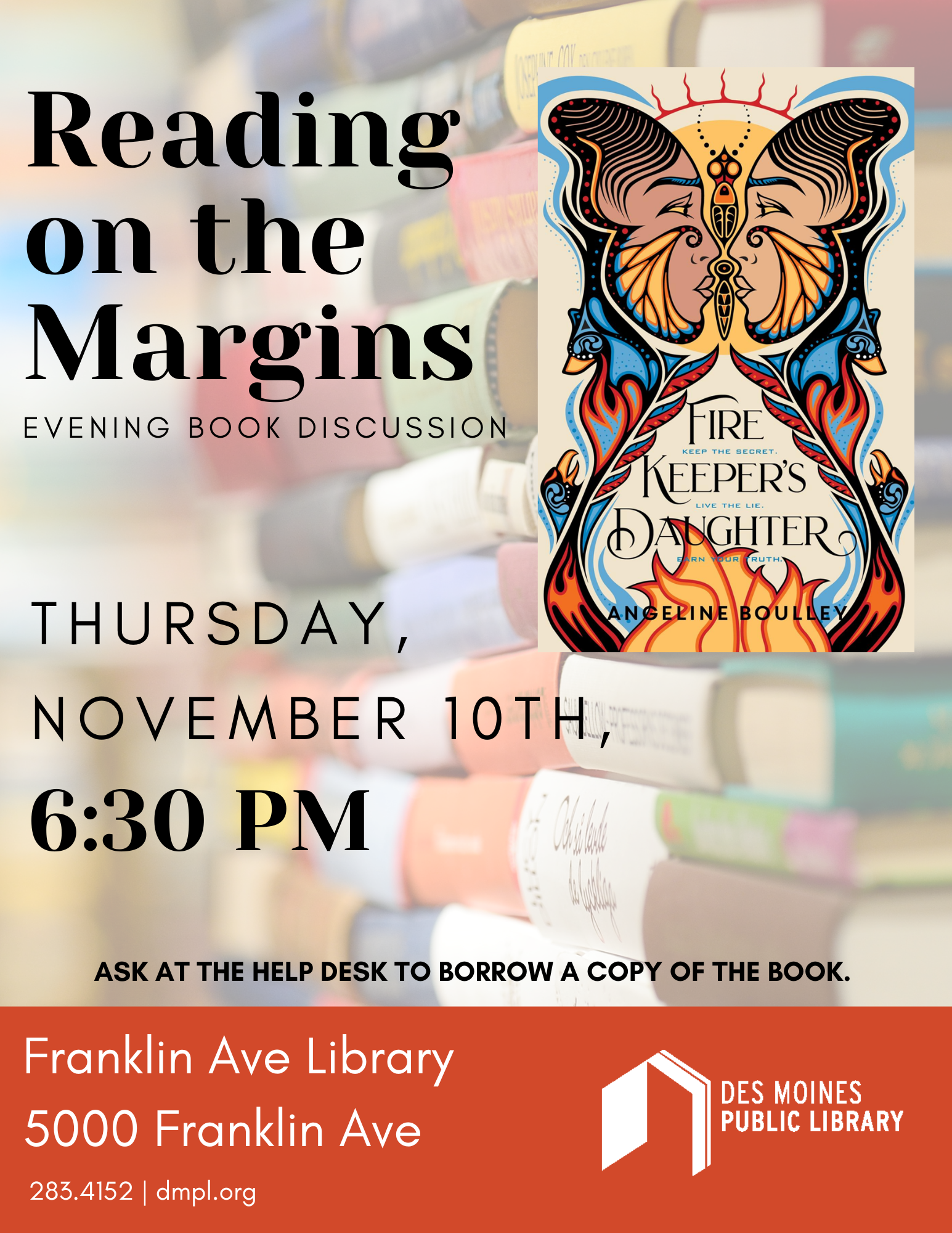 Our November selection is Firekeeper's Daughter by Angeline Boulley. Copies will be available for pick-up at the Franklin Ave Library Help Desk starting October 14th.