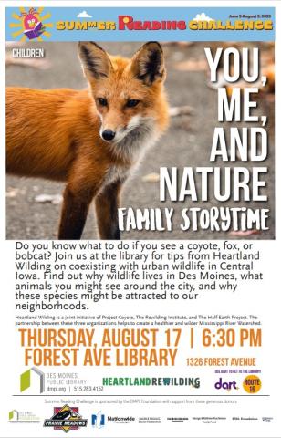 Do you know what to do if you see a coyote, fox, or bobcat? Join us at the library for tips from Heartland Wilding on coexisting with Urban wildlife in Central Iowa. Find out why wildlife lives in Des Moines, what animals you might see around the city, and why these species might be attracted to our neighborhoods.