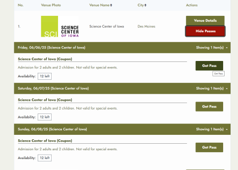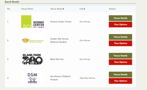The Blank Park Zoo, the Greater Des Moines Botanical Garden, the Science Center of Iowa, the Des Moines Children's Museum all accept printed passes, so we recommend you print your pass when you get the opportunity. As of right now, the Children's Museum and Blank Park Zoo will also accept digital passes.