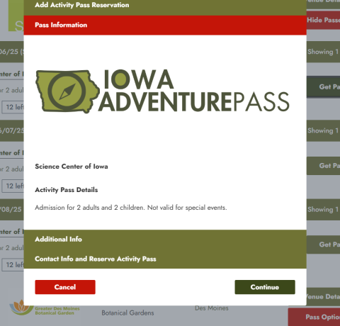 Use su tarjeta de la Des Moines Public Library (la biblioteca pública) para prestar boletos gratuitos a Blank Park Zoo (zoológico), Science Center of Iowa (museo de ciencias), Greater Des Moines Botanical Center (centro botánico), y Des Moines Children's Museum (museo de los niños). Cuando reservas una Adventure Pass con su tarjeta de la biblioteca, un día de diversión para su familia, amigos y usted. Cada reservación de boletos gratuitos es para dos adultos y dos niños. Miembros de la misma familia pueden reservar boletos al mismo tiempo si hay boletos disponibles. Si necesita boletos adicionales, puede comprarlo al destino.