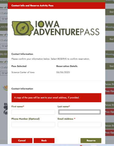 Si quiere cancelar su reservación, llama 515-283-4152 ext. 3. Necesita cancelar antes de 10 en la mañana el día de la reservación. Si no cancelarlo, no puede reservar boletos gratuitos al destino para 365 días.