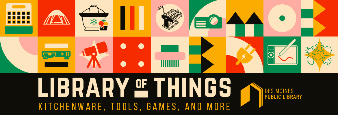 You know you can check out books and movies from the library. Now, we’re letting you borrow things to assist with home improvement, spruce up a party, or help you record and preserve family memories! It’s all available in the Des Moines Public Library’s Library of Things. The Library of Things is a collection of more than 50 items you’ll find useful in your everyday life. Before you can check out an LOT item, you must fill out and return this waiver (.pdf).